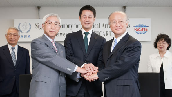 国際原子力機関(IAEA)とHICAREは,平成22年8月6日,被曝者医療の分野で,人材育成や共同研究などで協力していくことで同意し,「覚書」を取り交わしました。