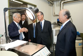 (財)放射線影響研究所 大久保理事長(左)から説明を受ける天野IAEA事務局長(右)